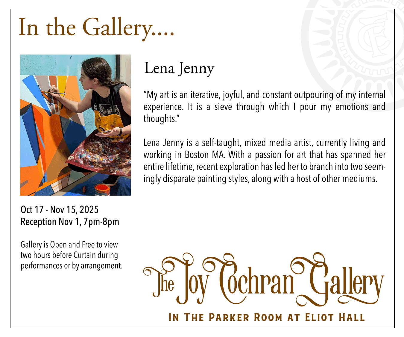 The continued revitalization and restoration of Eliot Hall will always be one of Footlight’s top priorities. Your contributions will continue to make it possible to take on large-and-small-scale restoration projects, as well as maintaining the day-to-day operations of the building.